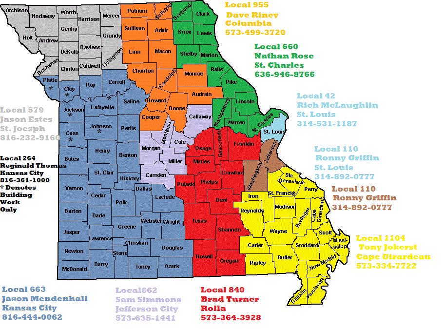 Hay 10 locales de construcción diferentes dentro de la jurisdicción del Consejo del Distrito de Trabajadores de Kansas y Missouri (MKLDC – Missouri and Kansas Laborers’ District Council). Cada Local tiene su área el cual es responsable de cubrir. Una de las formas más fáciles de comenzar su carrera es simplemente pasar por el Local de Trabajadores dónde vive y el área en la que planea trabajar. Vea el mapa a continuación: